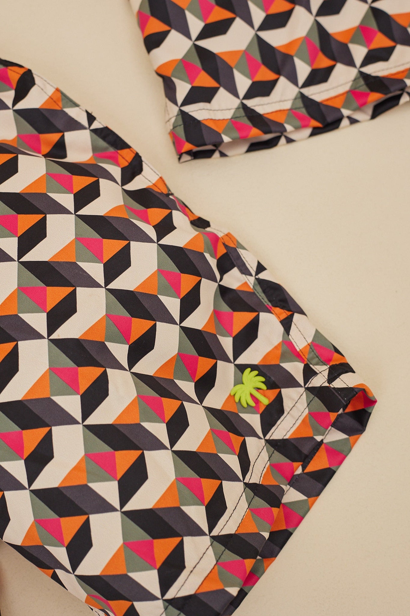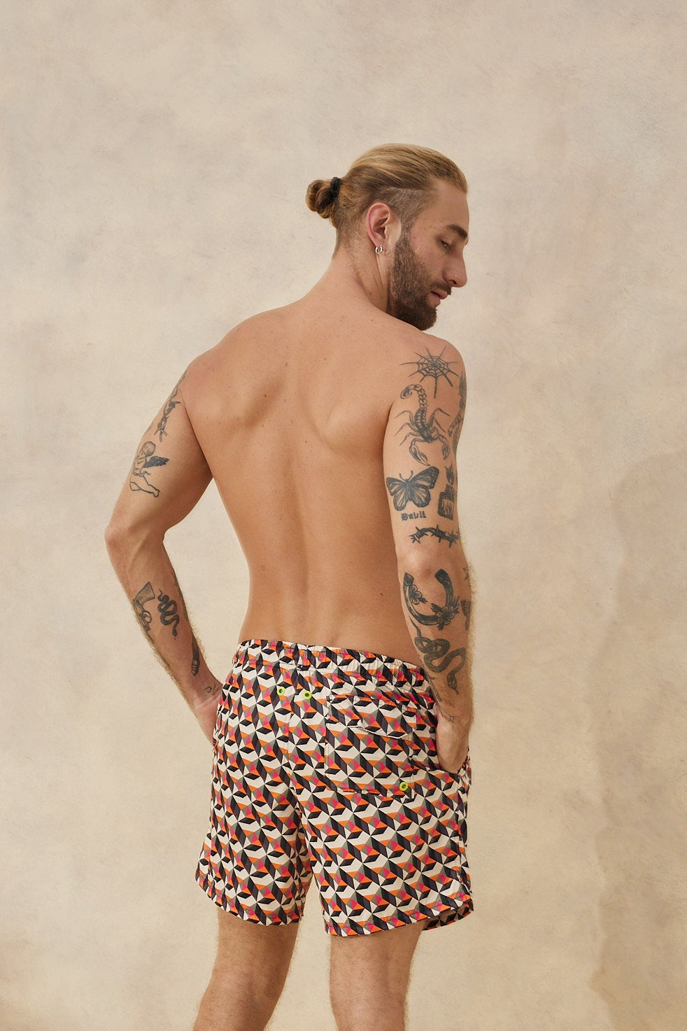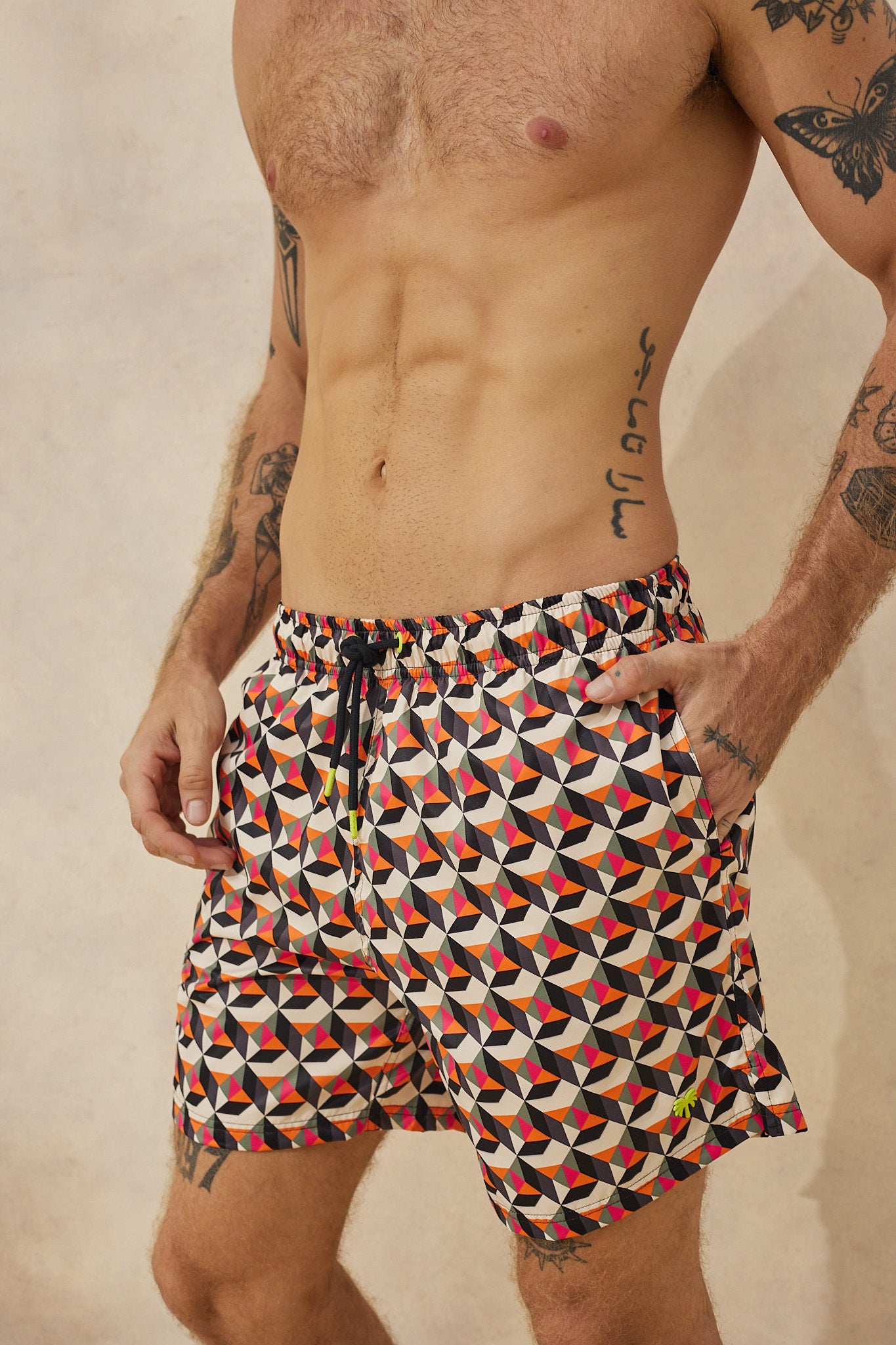 La pantaloneta de baño LOS CABOS de PLAIA se inspira en la energía contrastante de una de las playas más icónicas del Pacífico. Su estampado geométrico multicolor, con tonos cálidos y fríos que se entrelazan, crea un patrón dinámico y llamativo que transmite movimiento, fuerza y personalidad.