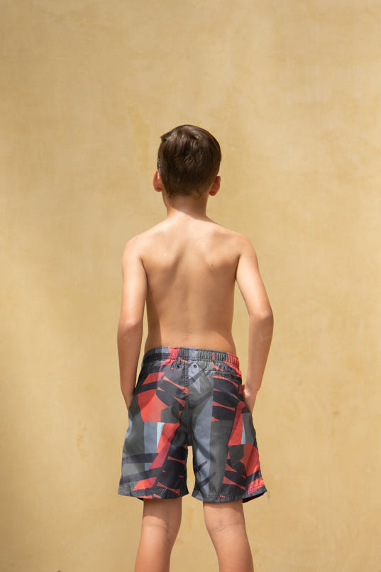 La pantaloneta de baño OIA KIDS de PLAIA se inspira en la arquitectura y los contrastes de una de las playas más emblemáticas del Mediterráneo. Su estampado geométrico en tonos gris, verde profundo y acentos terracota crea un diseño moderno y dinámico que aporta personalidad sin perder versatilidad.